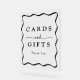 Add a stylish touch to your wedding, bridal shower, baby shower, graduation party, or other special event with this Modern Black Wavy Frame cards and gifts sign. The design features "Cards and Gifts" in bold black lettering surrounded by a black wavy border with a clear background. Personalise the retro cards and gifts acrylic sign with your custom text below. Please note: The wooden stand in the product mockup photo does not come with the sign. Zazzle sells a similar wood block for an additional cost.
