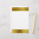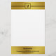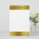 At the top, there's a display initial you can edit to show the right monogram. The black letter is inside a faux gold square that has a black border. Black lines are on both sides of the square. At the bottom, there are four lines of black display text for your custom text such as a name, professional title, address, phone number, website, or email address. The faux gold elements are not made of foil.