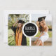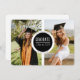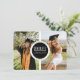 A modern chic simple graduation announcement card with two custom photos designed with a black and white circle on the centre where graduate name, bachelors degree and year of class are lettered.