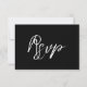 This modern wedding RSVP card features a hand lettered white script with the word "RSVP" on a black background. The front of the card has all of your RSVP details inlcuding meal choices in black caligraqphy on a simple white background. Please check out our I Love Weddingz shop to find more selections in this collection. Designed by Susan Coffey.