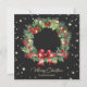 Elegant black photo Merry Christmas card featuring a watercolor wreath of berries, holly, pine cones and conifer tree branches. A photo at the back. Easily personalise this photo holiday card with your photo and family name.