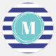 Modern Blue And Aqua Stripes Monogram Classic Round Sticker