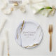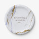 Elegant wedding paper plate depicts a simple modern blue, gold and ink abstract design. Features names of bride and groom.