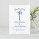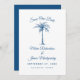 Ask your guests to save your wedding date with this simply elegant design featuring modern script, blue text and an artistic palm tree. Customise it with your wedding date, names and location.