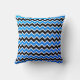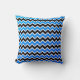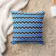 This modern throw pillow features a trendy chevron pattern in black, blue, and white.