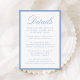 This wedding details card features “Details” in elegant light blue calligraphy, paired with classic serif typography for your accommodations, reception information, and wedding website. A light blue border frames the design with a crisp, airy finish that feels refined and timeless. The clean, structured layout offers a polished way to share important guest information while keeping your stationery look cohesive and elevated. Ideal for spring and summer weddings, coastal celebrations, and classic weddings, this insert card is easy to personalize with your event details.