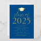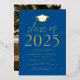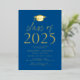 Invite guests to celebrate the grad with our modern class of 2025 graduation party invites. The invites feature a graduation cap at the top with "Class of 2025" displayed in gold foil lettering with a blue background. Personalize the invites by adding the graduate's name, school, and graduation party details. The gold foil graduation party invites reverse to display the graduate's photo.