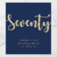 Minimalist 70th birthday blue and gold wine bottle label in modern, chic and elegant typography style. Featuring age "seventy" in sparkly gold. Customise with age, name, and year of birth.