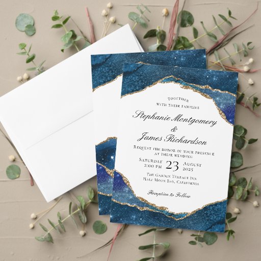 This modern design features classic shades of blue and aqua agate with metallic gold foil veins and sparkly stars. Add your own special touch with your names and wedding date.