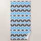 This beach towel features a colourful geometric herringbone pattern in blue, dark grey and white.
