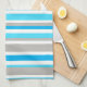 This colourful kitchen towel features a modern striped pattern in white, grey, and blue shades.