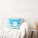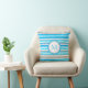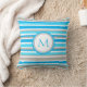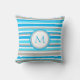 This modern square throw pillow features a colourful striped pattern in blue, grey, and white. Personalise it with a blue monogram in a round frame.