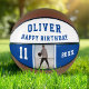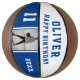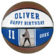 Custom Modern Blue Happy Birthday Photo Basketball. Birthday design with Happy birthday text, custom name, age, year and photo. Customise the age, name and add your photo. You can customise or erase any text on the basketball. Great birthday present for a basketball player or a fan.