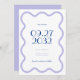 This wedding save the date card is feature a wavy border. It uses calm colours like lavender inspired by lavender fields. The fun and stylish fonts add a touch of elegance, and word at the centre are highlighted in bright blue for a fun pop of colour and uses a bigger font size.