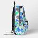 This modern backpack features colourful geometric pattern in black, blue, and green shades on a white background.