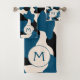 Stylish, trendy, bold double cow print monogram bath towel set in blue and cream. Inside the circle, there is a placeholder blue lettered monogram, which is CUSTOMIZABLE so you can add your initial. When it's time to revamp your bathroom decor, surely you can't go wrong with some bold cow spot patterns... Choose from a wide selection of matching gifts by Berean Designs.