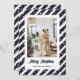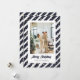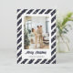 Blue and white striped photo Christmas card featuring a blue and white photo frame with stars and a modern font type. Easily personalise this festive photo holiday card with your photo and a family name.