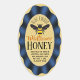 Modern blue ribbon border over a gold background featuring a bumble bee graphic at the centre to create your own elegant honey jar stickers. Customise the text with the brand name of your beekeeping business, contact information, type of honey, weight, and date, Designed for oval and queenline honey jar containers, upside down squeeze bottles and quart mason jars.