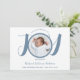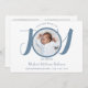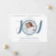 The front features the word joy in stylish blue script typography and your newborn's photo, full name, arrival date, and birth stats.