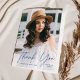 Modern photo graduation thank you card featuring the graduate's vertical photo with "thank you" in a handwritten blue calligraphy script overlay. Personalise the front of the graduation thank you card by adding the graduate's name and graduation year. The inside of the folded graduation thank you card features a trendy blue and white dotted geometric pattern on the left with your typed or handwritten message on the right.