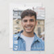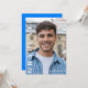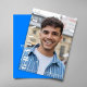 Celebrate your graduate with this modern graduation photo card featuring a stylish vertical name layout and bold blue background. The front highlights a full senior portrait with the graduate’s name displayed vertically for a clean contemporary look, while the back includes space for graduation party details, class year, and celebration information.