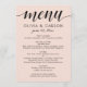 Modern and chic blush pink wedding menu cards feature a stylish black typographic design with bold calligraphy script accents and elegant custom text that can be personalised with your delicious dinner menu details and a monogram of the bride and groom names and wedding date.