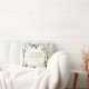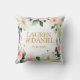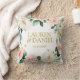 A beautiful wedding keepsake throw pillow with watercolor botanical floral wreath with green greenery, blush pink, white and vanilla, peach, roses and peonies on white background and modern lettering in faux gold colour