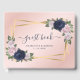 Elegant navy blue and blush floral wedding guest book with a modern script font title and a gold geo frame adorned with blue and blush roses. Matching items available.
