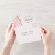 The left-hand edge of this elegant modern all-in-one wedding invitation and RSVP features a blush pink watercolor agate border trimmed with faux gold glitter. The customizable text combines charcoal gray handwriting, copperplate and italic fonts on a blush background. The return address appears on the outside flap and the reverse side of the detachable RSVP card.