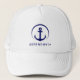 Modern nautical-themed hat featuring a a navy blue illustration of an anchor within a circle and your boat's name in simple typography.