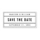 Stylish Save the Date Rubber Stamp featuring your names and date in bold fonts between divided rectangle border.