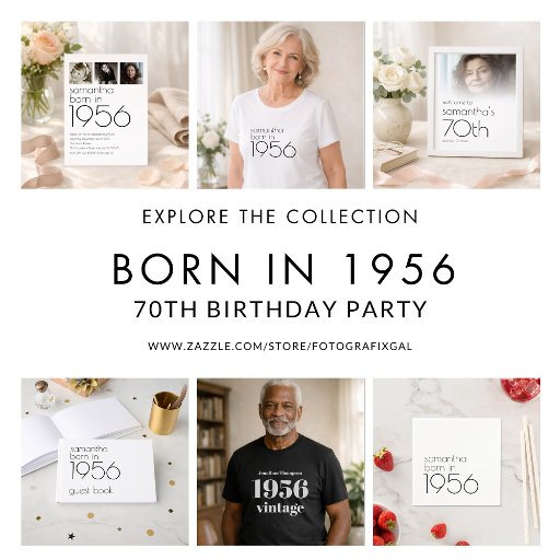 Modern Born in 1956 4 Photos 70th Birthday Party Invite. Simple elegance. Easily personalise the text to your own requirements and replace the sample images with 4 of your own photos of different ages.