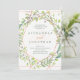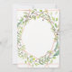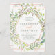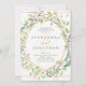 This elegant wedding invitation features a modern, copper look geometric frame with a trendy green leaf-filled wreath.