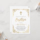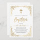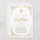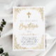 Modern, elegant botanical gold Baptism invitation. Design features elegant gold botanical frame, gold cross, handwritten script ''Baptism'' and celebration details in trendy capital black lettering.