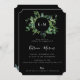 Modern botanical greenery, engagement party invitation. Card design features, watercolor leafy branches in shades of green and blue. Monogram greenery wreath and elegant typography template design. Background colour of card, shown in solid classic black.