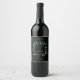 Elegant watercolor greenery, black wedding wine bottle label. Label features modern watercolor botanical foliage frame. Template text lines for date, names and location.