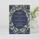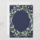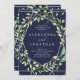 This elegant wedding invitation features a modern, silver look geometric frame with a trendy green leaf-filled wreath on a midnight blue background.