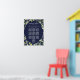 This elegant wedding seating chart features a modern, silver look geometric frame with a trendy green leaf-filled wreath on a midnight blue background.