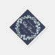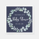A modern baby shower napkin matching our invitation set, with a navy background, a blue green watercolor eucalyptus wreaths, and white text in sans serif and hand lettered font. Personalise with your name and shower date.