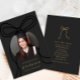 This elegant black and gold graduation party photo save the date announcement features a chic black bow with modern circular photo on a simple black background, and includes save the date graduation party details with a gold bow on the back.