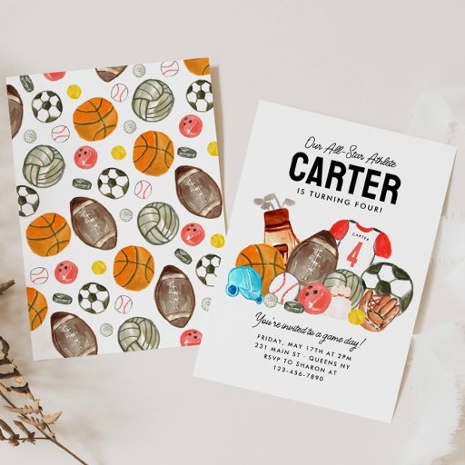 Modern Boys Sports Balls All Star Kids Birthday Invitation