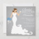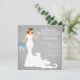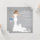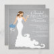 Stylish modern brunette bride wedding shower invitation features a chic modern bride toasting with a wine glass while holding a beautiful bouquet of dark blue wedding flowers set on a printed on paper popular grey grey linen background with stand out white text. Our modern bride bridal shower invitation is perfect for a popular wine bridal shower celebration. Visit our shop to view this beautiful bridal shower invitation in a large selection of floral bouquet colours and different bride variations.