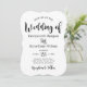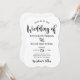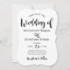 A bold portrait wedding invitation with a decorative bracket die-cut shape featuring oversized black brush script "Wedding of" lettering on a clean white background. The playful yet modern typography pairs hand-lettered headers with clean serif details for a fresh, contemporary feel. All text is fully editable to personalise your celebration.