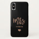 This stylish phone case says "Mrs." in trendy, faux rose gold script typography on a black background, and also has a spot for your last name and a matching heart.