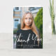 Modern graduation thank you card featuring the graduate's photo with "Thank You" in white brush script lettering. Personalise the front of the photo graduation thank you card by adding the graduate's name and graduation year. The inside of the folded thank you card features a black and white striped design on the left with space for your typed or handwritten thank you message on the right.