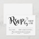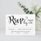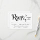 A coordinating RSVP card featuring the bold black brush script "RSVP by" header with attendance response lines and an entree preference section for three meal options on a white background. The calligraphy script meal instructions add an elegant touch to the modern design. All text and meal choices are fully editable.