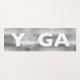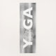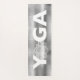 This modern yoga mat features brushed metal background in silver grey and text image "Yoga" with lotus flower. Perfect for your yoga routine.