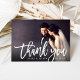 Stylish wedding thank you note card template features a rustic brushed script "thank you" overlay design with modern monogram and a landscape photo of the bride and groom on the front side. Includes a second landscape photo and custom text that can be personalised on the inside. The black and white colour scheme can be completely customised.