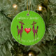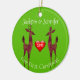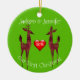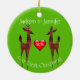 A buck and doe celebrate their first Christmas on this modern apple green ornament. The text is easily personalised.