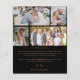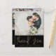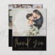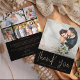 Make a statement with this modern wedding thank you card featuring luxurious faux gold calligraphy on a sleek black background. Designed with space to showcase five of your favourite wedding photos, this elegant two-sided layout is perfect for sharing memories while expressing heartfelt gratitude to your guests. Personalised with your own images and message, this black and gold thank you card creates a timeless keepsake. Ideal for sophisticated weddings, glamourous celebrations, or custom post-wedding stationery.